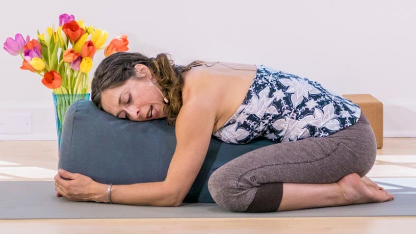 The bolster, again, you wanna feel this more towards the base of your shoulder blades. It's almost like you're doing a little Minor Shoulder Stand, just a little precursor to something like an Inversion. Let the weight of the body release into the support. And try to keep encouraging the earth element, the feeling of heaviness, if you're having insomnia, so you want to become as heavy like a rock and imagine that rock is sinking slowly down to the bottom of a lake. And if the body starts to feel heavy, oftentimes the mind will start to also slow down, perhaps become more stable.