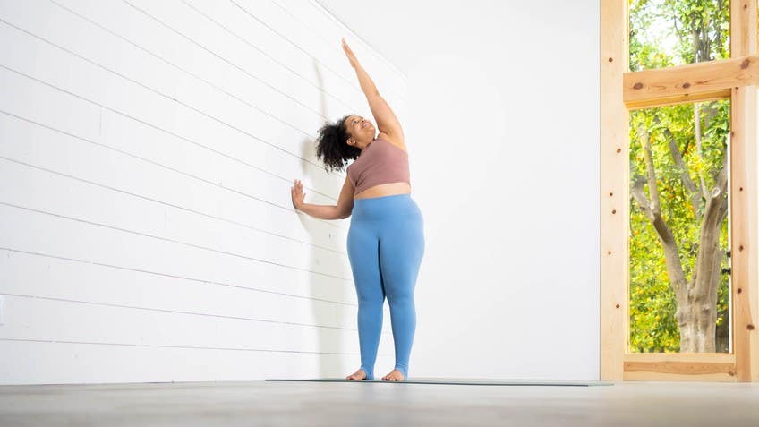 And if you get here on your wrist as really unhappy about this shape, instead of palm up, you can always make a fist with your hand and put your knuckles on the wall instead. Roll your inner thighs back until your feet parallel to each other, and then scoop the pit of your abdomen in and smooth the flush of your bum down. Creating some supportive length for your lower back. Lift through your heart center and roll your shoulders onto your back. Rotate your left arm externally so that your palm faces forward, and then press down to the Four corners of your feet reach your left arm in line with your ear.