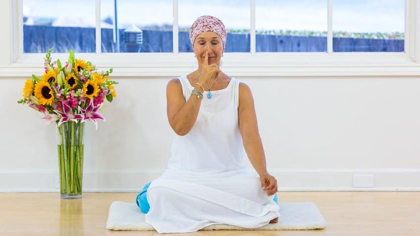 Do the best you can, let's begin. Inhale left, block the left nostril, exhale right. Inhale left, exhale right. Inhale left, exhale right and keep going, enjoying the breath, moving in and out of the nostrils. Inhale left, exhale right.