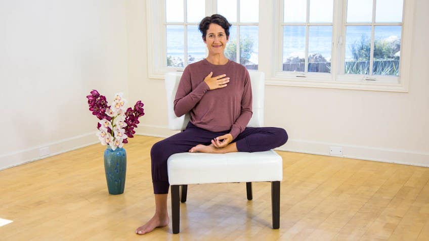 Hi there. Let's begin to let our breath tether us inward. So step one, be comfortable. Find the seat where you feel supported. It can help to allow for a deliberate inhale, followed by an audible exhale. Let's do that again. Inhale and exhale. Let your natural generosity of heart help find your spine's alignment. And find the proper placement of your skull so that your head feels supported by your spine. Nice. Begin to notice that you're breathing. And as soon as you notice that you're breathing, your breath will change. Just like all of us change when somebody starts to pay attention. In fact, everything changes when we start to pay attention. And then for the purpose of practicing paying attention, begin to become aware of the movement of the breath in your lower belly. If it helps, bring one hand or two to your lower belly. You might let your eyes close or softly focus in front of you. And just begin to feel how the belly gently expands and opens on the inhale. And how the lower belly softens and retreats on the exhale. There's no need to artificially force the breath to be bigger. There's no need to strain. Nice. Okay. Gently relax this effort. And now begin to feel how you can breathe more into your lower side ribs. And while you do not need to use your hands, sometimes it can help. And most of us, it's easiest if we offer a little bit of a hug, kind of crossing the arms underneath so the fingers find the lower side ribs. And the invitation is to simply be interested in how as you inhale, the ribs widen. And how as you exhale, the ribs soften. Eyes could be closed or softly focused. This sometimes tempts the breath to deepen a lot. Like she starts to kind of want to show off a little bit and prove how big she can make the ribs. Just let her do her thing. Beautiful. One or two more like this just depends on your particular breath space. And then eventually release your hands and just rest in the effect. And now begin to become more aware of how the upper ribs respond to the breath. More around the region of the heart or really more above the heart. And if you'd like, you could even bring one hand up to this upper chest region and just feel the natural encouragement arise on the inhale. And fall on the exhale. Again, eyes might be softly focused or closed. Like really start, you're starting to practice tuning your inner eye inward. Letting the movement of the breath in the body help. Nice. Gently, as you're ready, release the hand if you've been using the hand as an assistant. Pause in the effect. And we're going to tune to one last place, which is to become aware of the breath in the upper collarbone region. And the lift up and around here. And if it would help bring your fingertips so lightly just on those upper collarbones. Just to feel this gentle rise. Beautiful. Let your hands now rest either on your legs or in your lap. Let your eyes close or softly focus. And together now we'll find three breaths, specifically aiming to be aware of each of these areas. And then we'll rest in the effect. So only as you're ready, on an upcoming inhale, begin to feel the inhales opening of the lower belly. Widening of the lower ribs. Expansion of the upper heart. And lift up through the collarbones. And as you exhale, feel the collarbones fall.