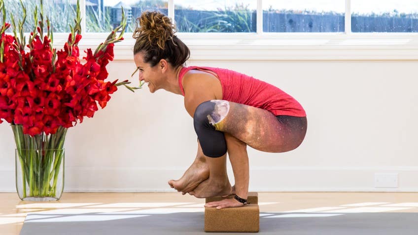 Let's do that again, bend your knees, reach the spine forward as you inhale, exhale, lift the hips, press the inner knees against the outer arms. Once more like that, inhale to shift forward, and as you exhale, we're just kind of massaging into the shape and the feeling of Bhujapadasana. Let's bend the knees once again, release your hands, take them to the front of the mat, step back to downward facing dog, shift forward to plank on an inhale, exhale, lower halfway to chaturanga, inhale, open the heart, exhale back to downward dog. Let's take one more standing sequence here, inhale right leg to the sky, exhale, step through to a runner's lunge, and let's lower the back knee down, inhale, reach up to crescent, a low crescent pose, and as you exhale, bring your hands to your heart, but back the hips up, back your pelvis up so that it's directly above the back knee, so rather than staying in a released lunge, just stack the joints here so we have a 90 degree angle at the front knee, and a 90 degree angle at the back knee, and then come into a forward fold right inside that front leg, bringing your hands inside of the front shin. Same thing here, we'll wrap our hand around the outer edge of the right ankle and start to snuggle your shoulder behind your knee, and we're basically just taking one half of bhujapadasana, let's inhale around the spine, and then as you exhale, reach the heart forward, the hips back, fill this version of cat cow here as you inhale to round, exhale, heart forward, tailbone back, once more, inhale around, coiling your energy inward, knee presses against the outer arm, exhale, heart forward, hips back, now plant your palms flat, curl the back toes under and lift your back knee, and we're just gonna fill one half of bhujapadasana here for a moment, so press into your hands, pull up through your core and lift your front foot up, and feel that pressure, that pressing of the knee against the outer arm, let's wrap it around, and take it back into down dog's split as you inhale, exhale, step it all the way through into a runner's lunge, and a little rainbow warrior to come all the way up and over to the other side, stepping back to down dog's split, left leg is high, take a breath here, exhale, step it all the way through to a runner's lunge, and lower the back knee, shift the hips back, inhale, reaching up towards the sky, and exhale, hands come down through the midline, keeping your hips stacked above the back knee, and allow your left shoulder to start to snuggle inside your left knee, and we'll take that same cat-cow pulsation here as you inhale, round your spine, exhale, heart forward, hips back, inhale around, exhale, once more, and exhale, plant your palms flat, keep that little connection of your knee against the outer shoulder, let's curl the back toes under and lift your back knee, and then draw up through the core, and lift the front foot up towards the midline, feeling one half of bhujapirasana, wrap it around the bend and up and over the elbow, reaching back to down dog's split, exhale, step it all the way through, rainbow warrior comes up and over and back to downward facing dog, inhale to your tippy toes, and as you exhale lower the knees kind of wide, big toes touch, and let's take a moment here in child's pose, take three very deep breaths, and slowly make your way back to your hands and knees, and let's take our blocks and bring them to the mat so that we can work with them for workshopping and playing around a little bit with bhujapirasana, so we'll take the blocks about hips width apart, bring your hands back to the mat in front of the blocks and press back to your downward facing dog, and let's just walk the feet right through the blocks and come into a forward fold with your heels in front of your blocks, lift the heart halfway, as you exhale forward fold, dry your hands right in between your feet, bend your knees and cup the back of the ankles, so from here it's really important to set up before we go in bhujapirasana to really take the time to snuggle your shoulders behind your knees, so you're pushing your hands forward as you tuck the shoulders in and back, so we create a surface for our legs to rest on, and then place your hands on the blocks with your fingertips pointing forward, heels of the hands down and just have a seat on your elbows and you might reach the chest forward, and what's interesting about these postures and all the coiled arm balance postures is this dual action of coiling up through the core and reaching forward through the heart at the same time, so see if you can feel that pressing of the arms with your knees, coiling up through the belly and then just start to walk your toes in and you might find that you can lift the feet and hook the ball of one foot over the other, chest reaches forward squeezing the inner knees against the outer arms and feeling that wonderful balance of bhujapirasana, maybe release your feet and then come back into a forward fold and let's take padahastasana to release the wrist, so place the hands right under the feet, look forward on an inhale, exhale, bend your elbows and release down and take a moment here and maybe shrug the shoulders alternately up the spine, relax your head and neck, so shifting the shoulder blades to massage the neck and the head and then let's go ahead and try it again, so release your hands, inhale to lift the heart halfway, exhale bring your hands to your hips, let's come all the way up to standing for a moment just to open up the front of the hips, take your hands to the low back so the fingertips crawl up the spine and the heels and the hands point down and lift up through the chest, give the hip flexors a little air, open the heart towards the sky, take a full breath in and then as you exhale bend your knees, pour your spine down, dive your hands through and once again take your hands to the back of the ankle, so let's try it again and snuggling your shoulders behind your kn