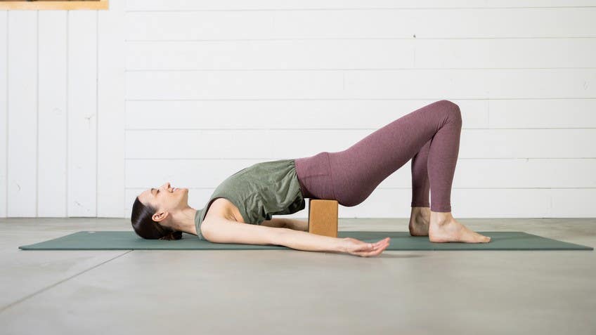 And then take your block any height. So you have the low, medium, or highest height. I'm gonna take it to the medium height. Lift the hips. Slide the block under your sacrum, the very low back. And then just let everything melt down.