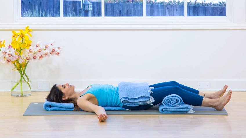 Welcome to our relaxation to ease deep tension in your body and your mind. We're going to go through a relaxation practice, a shavasana practice, where we will do what's called progressive relaxation, which simply means we're going to squeeze and release muscles, first we'll adjust the legs one at a time, then the arms and the whole body. I'm using four blankets for my own comfort. The most important practice is to support yourself with something under your legs. I'm using one rolled blanket supported by a second blanket for height.