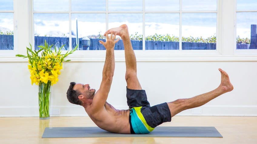 Open it with your exhale. You can take your drishti or your focus towards your right thumb. Thinking about that pulsing, twisting movement, massaging the organs, releasing some of the toxins and then flushing it back with that fresh nutrients and blood. Good. Slowly unwind. Lower the right leg. Extend it and then hug the left knee into the chest. You can grab the shin or the back of the hamstring, whichever is easier. This is usually easier, a little bit more challenging. Try not to use your neck muscles. Let the head be really relaxed as the knee pulses forward and back. Creating a little space between the vertebrae of the back. Giving you nice mobilizers for the spine. Helping to release some tension there. And then go ahead and extend your left leg to the sky. Giving yourself a little hamstring stretch. Right leg active. Left leg active. Arms by the side. Shoulders on the floor. Take a big inhale. Exhale, reach. Inhale, lower. Try not to tuck your chin to the chest and do chin crunches. Look straight up. Neck is soft and relaxed. All the work is coming from your core muscles. You've got five more. You can lift that right leg off the floor or you can keep it down for five, four. Keep breathing. Two, one. Lower down. Invite the left knee into the chest. Take it all the way across the body. And then that arm pulse. Inhale, and then send it across with your exhale. Inhale, send it across with your exhale. Inhale, send it across with your exhale. Give yourself a moment here. Enjoy that nice thoracic twist. And then come on back to center. Hug both knees into the chest. Give yourself a little cross of the legs and we're going to rock forward and backward. Forward and backward. Give yourself a little more momentum so you can rock up to your seat. And we'll sit in a nice cross-legged position. Bring the palms right on top of the thighs, taking a little cat tilt of the spine, pulling the navel up and back, and lifting the heart for a cow-till. Pulse with your breath. One more cat and cow-till. Exhaling, drawing the navel up and back. Inhaling, back to center. Go ahead and extend your right arm out to the side. Left arm up and over the ear. Flip the palms so the palms facing the crown of your head. And just bend into that right elbow and release. Think about sinking a little bit deeper, but keep lifting through the right rib cage so that you're not collapsing into the side body. The next time you get that pulsing sensation, pause and then invite your left sit bone to drop closer to the floor. Go back to the breath. Slow, deep inhales, pauses, and exhales. Left palm place it on top of the right knee. Right fingertips walk behind you. Tall spine. Invite that right knee down to the floor. Big inhale. Soft rotation as you exhale. Big inhale. Soft rotation as you exhale. Keep your left hand where it is. Cross your right arm on top of the left. And we're going to start to squeeze the knees together. Keep the knees squeezing together. Lean back just a little bit and then start to press your knees back to the floor. This is going to give you a nice stretch through the upper back and shoulders. Squeeze and then, oh, feels so good. Let's do at least one more. Pulse. One more. Squeeze and pulse. And like any detoxifying flow, remember not to eat two hours before you do this practice.
