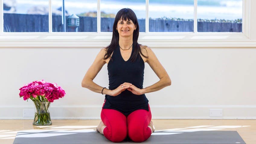 Hello and welcome. In this practice we're going to use the diaphragm, diaphragms of the body, mainly the respiratory diaphragm, to help align the body with clear breath. It's important that you're seated comfortably. I have a tutorial on finding your seat in season 3 of Welcome to Yoga that you could reference, but feel free to sit in a chair, cross-legged. I am most comfortable in Virasana in this kneeling position, so that's how I'm choosing to sit, but definitely find the best seat for you. It's important that you're able to sit with the pelvis upright so that the spine can lift. So the diaphragm muscle, I'm going to use the fingers, kind of find with a muscle. So with your fingers, find your sternum or your breastbone and bring your fingers to the bottom of the breastbone, the xiphoid process. And then with your fingers, just palpate along the bottom of the ribs. And this is where I'm going to dig in a little bit if you're comfortable with that. This is where your diaphragm muscle connects and connects all the way around. The muscle is kind of like an old-fashioned record. It's thin and circular, vinyl. So it connects all the way around there, the base of the ribs and it draws down in the back. But for our purposes, I'm going to think of it being like a record player, a record, connecting to the bottom of the ribs. Rest your hands onto your thighs and close your eyes. And let your breath deepen. And just notice your perception of that diaphragm muscle. Notice how you feel it. It moves. Notice the right side and the left side, the front and the back. And even if you've studied anatomy or you know, and you know about the muscle, see if you can do this exercise with a fresh perspective, as if you just dropped into your body and you're experiencing this breath and this muscle for the first time. Fresh, fresh eyes, you see the experience of the diaphragm inside. And as you're doing this, invite your breath to be long and smooth. Sometimes moving into a long, smooth breath is a process. So if your breath feels short and choppy right now, that's completely fine. You just plant the seed and give the invitation for the breath to lengthen with a smooth quality. So now a little information about the movement of the muscle. When you exhale, it domes upwards. And when you inhale, the muscle flattens and widens. As you exhale, the diaphragm domes up, it pushes into the lungs and the lungs expel the air. As you inhale, the muscle flattens and widens. If your eyes are closed, maybe open them and make the same gesture I'm making with your hands, just interlacing the fingers. And with the hands emulating that movement of the diaphragm, sometimes it's a little, it seems a little different than what it is. So using the hands always helps me to really tap into the movement of the muscle. So exhaling the muscle domes. Inhale, it flattens as the lungs expand. Exhale, you can feel the muscle, the center of the muscles drawing up, making a dome.