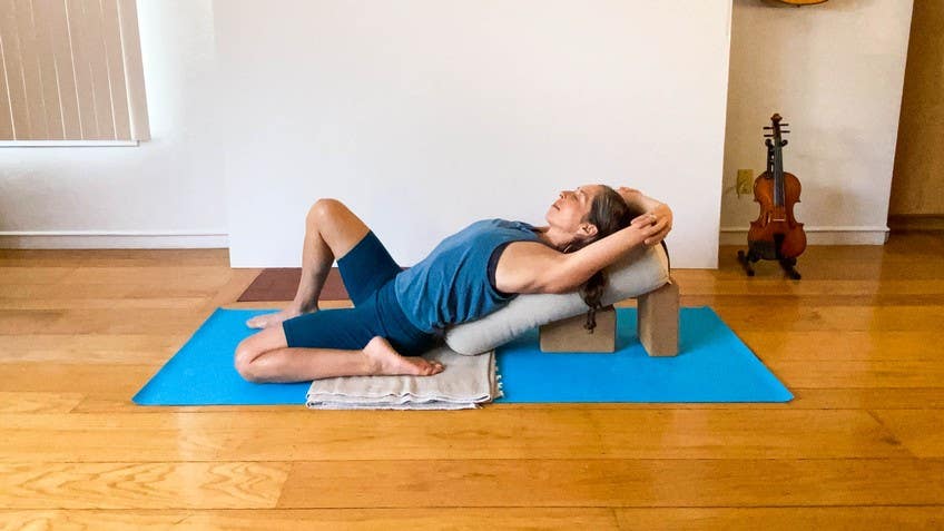 Just take a moment and name that. If you're ready now over the next moment or two we'll let the eyes open slowly if they've been closed and with that soft focus we eventually come into a more open eye position and we'll do a little switch now of your prop where you slide your bolster down to the floor and I'm going to turn the blocks now to one tall and one medium and then from here I'm going to tilt my bolster onto the blocks and that's going to be where my back goes in a moment. So I'm going to turn now so my knees are at the front of the blanket we're going to try to sit down in front of your bolster and if that doesn't work for you you might be sitting with your feet closer together or an extra prop underneath your sit bones. I encourage you to bring your left foot forward arms up to the side fingers to the side as you ease your way back onto your bolster. So eventually you find this place where the right thigh quadricep is getting a nice stretch the left leg is bent and we're trying to settle the buttocks towards the floor.