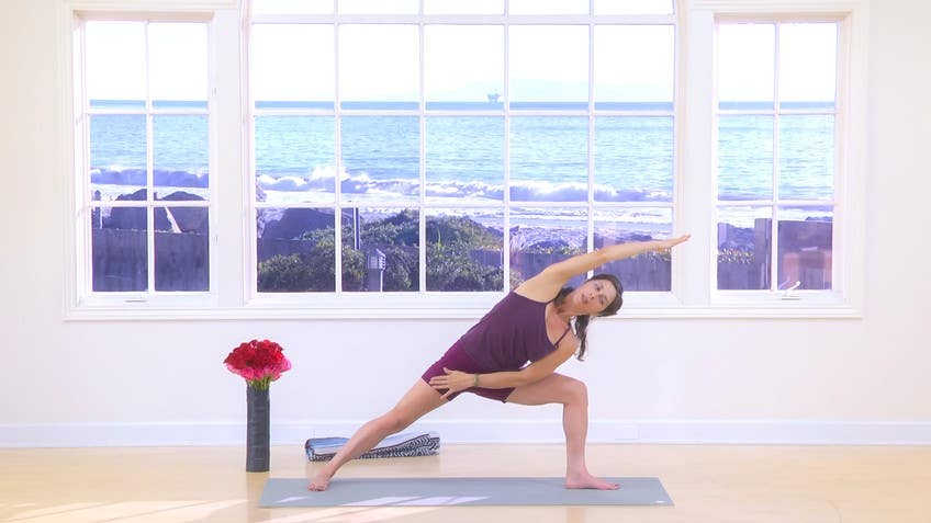 (ocean waves crashing) Welcome to the Elemental Soup practice. This is a practice where we'll spend a little bit of time working with all the elements, so it's a nice, full practice to help maintain your sense of health and wellness. The only prop that we're gonna need today is a blanket, and if you can take a blanket, oftentimes we might find it on the shelf in that shape, and we're just gonna try to make a roll. If you have a thick, wool one you might make it a little bit smaller, not a full roll, if that's too big, but something of that shape. So if we lie that down, stretch your legs out in front of you, and then slide this so that it lands near the base of your shoulder blade so that when you come down to the floor with your head, your shoulder blades can melt back into the floor, and arms out to the sides.