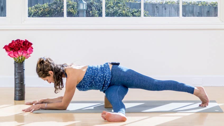 As you lean over your front leg, touch the ground with your fingertips, and then from that lunge position we'll pause, step back into downward facing dog, and bring the knees down to the floor. So a block can be useful for this next pose, placed the wide way for you to rest your hip on if we need this variation when we straighten the legs. Take the right leg out to the side with the edge of the foot on the ground, and then we're gonna lower your hip to the block that we've placed on the mat. Take a look that your back knee is up away from the floor and your back toes are curled under the back heel. If we turn and face the small edge of your mat, we're gonna walk the hands forward so that you could root down with your elbows.