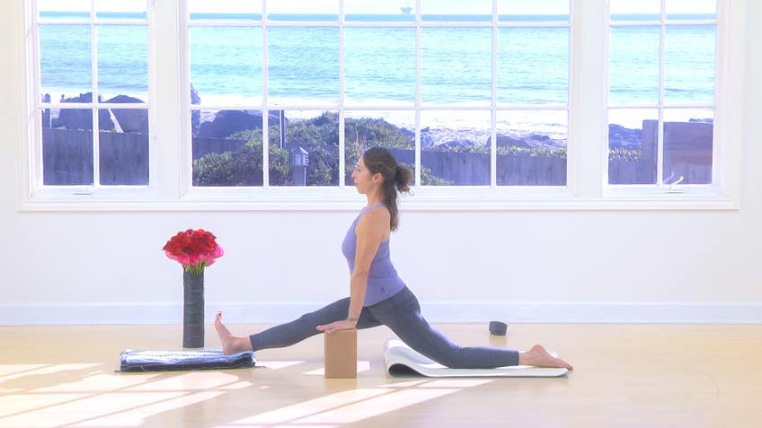 Eventually point the toes to the sky and then find your edge how far you sink forward and down with your hips while lifting up and back with your spine. And just taking a moment again to appreciate that space in the legs that work up into the spine, up through the crown of the head. Take a few more moments to ease in and down. Okay and then we'll gradually slide that right heel in and with both knees on the floor, curl your toes under, then we can set the blocks out of the way. We won't need them for the rest of the practice.