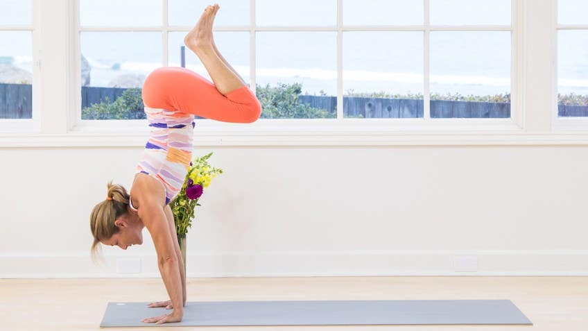 And then softly lower the torso over the left leg. So a couple options, you can hang out here, left hand behind. You can play right hand behind if you usually do the left, just a little change. For those who wanna get upside down, bring the palms down, right leg lifts, and then draw the left knee in. When the left knee's in, you can start to take (exhales) both legs up.