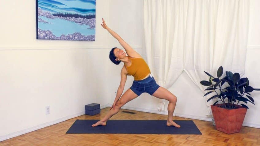 Knees a little over the toes. Notice how that is on your knees. You can always adjust. Maybe you stay there. Maybe you go over your left knee and find that extended side angle. You don't need to straighten your right leg. One way and then the other. Find your balance there. Come back into the center. We're going back over the left toes. This time it's like a reverse warrior. So going away from that left knee. Allow it to feel really good. That big side stretch. Going over your right knee. Away. Coming into the center. So we're going back over that left knee. We're doing that reverse warrior. And then we're grazing our right fingertips to the floor. We're turning it all the way into a twisted lunge. Right hand down. Left arm up. Back at the mat. Now you're welcome to stay there for a couple of breaths or walk your left foot back. Turn onto the outer edge of your right foot. Maybe stack your feet into Vasasasana. Breathing there for a breath. You can even take your left arm over your left ear. And then slowly bring it back into your twisted lunge. The back of your mat. Walk it all the way around. Support yourself with your hands if you need to. So you're in that wide-legged squat. Position, knees out, toes out. Let's try the other side. So taking your right knee over the right toes. And then reversing away from that right knee. And then left hand comes to the floor. Turn on your back foot. So you're turning on your toes until you're in a twisted lunge facing the front of the mat. You can turn your right toes out. Turn your left foot onto the outer left edge. Maybe stay there if you want. Stack your feet. Take your right arm up out and over. Side plank. And step it back forward. How can your whole body be involved in that movement? Back into your twisted lunge. And then walk it all the way back into your wide-legged stance. Press into your feet. Come on up. Parallel your feet. Come on down through the center. Your choice. Hang down in the center.