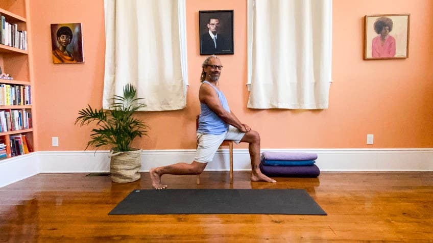 And breathing. Your next exhale, you can bring that knee forward again and pressing the right knee into the right palm, holding that for about 10 seconds. You may feel your psoas working a little bit here. It's a very deep muscle on the front side of the spine. And then releasing that, extending the leg back into a high lunge, standing or using the support of the chair, pressing back through the back heel to get this length happening here. Keeping the heart lifted, the spine vertical.