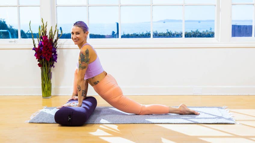 It might take a few steps to get it there, whatever it takes to bring that foot forward and then your back knee will come down. You can always use extra padding under the back knee if you need it. And then it's nice to bring the floor to you if it feels far away. So I'm going to use a bolster underneath my hands so that I feel like this is sustainable and I can really sink in a bit here. So Hanuman, this monkey god, he's a god of energy and power.