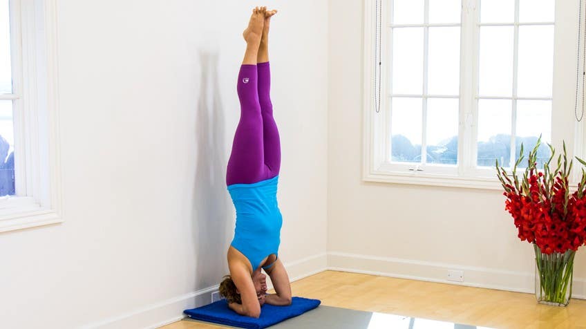 So this provides a little bit of extra padding, so you can take a blanket to the wall if you like. And one of the things that's really important with setting up our headstand is to provide a good base so that we're actually not resting all of our body weight on the crown of the head, but just a small percentage of our body weight. So when you come down to start to set up, take your hands to opposite elbows to measure the base of this triangle that we're going to create. So hands come to the opposite elbows, elbows are lined up under the shoulders. And then from there, lace your fingers together.