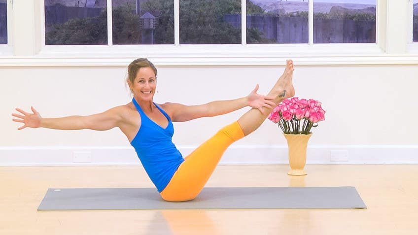 Coming back into Navasana, boat pose. So, again, starting hands at thighs. Heart lifting, low back lifting. Good. Staying here or if there's no mischief in the low back, you can straighten the leg, take the arms up. On an exhale, left arm comes forward, right arm back.