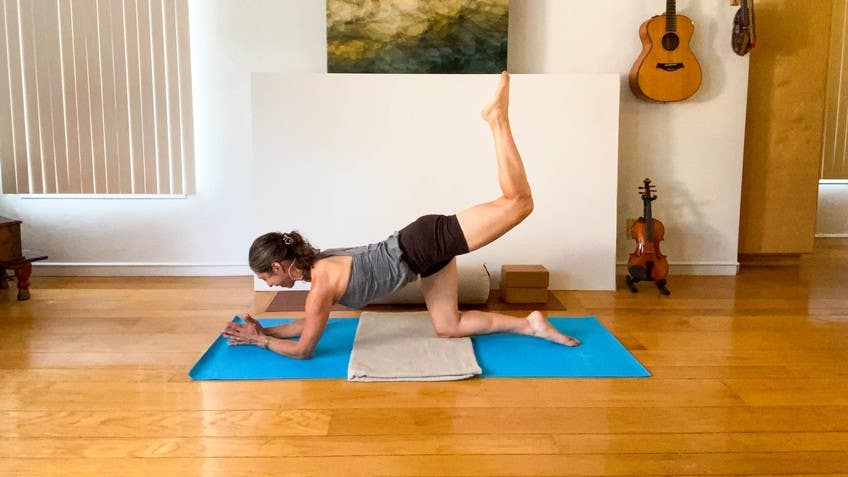 So as we take the bolster out of the way, blocks to the side, please come down to your elbows. Put your elbows on the floor under your shoulder line and bring your knees almost touching. Relax the feet and start to swing your left leg up into the air while you keep your left leg bent. Imagine it's a little scorpion and you're lifting the tail towards the back of your head. Now let's bring your left knee towards your nose and round your back and lifting your left leg again.