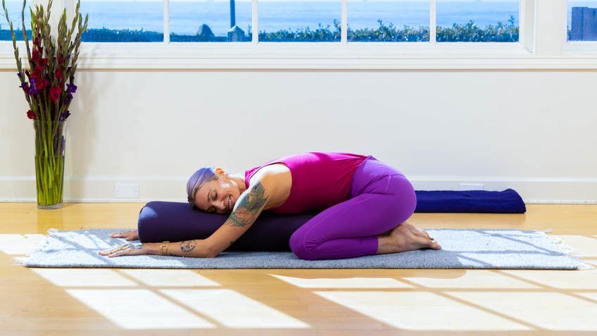 So thinking about the breath like water, and the breath like spring rain, watering the soil of you, soaking every inch of your landscape, soaking your heart so that your heart could be like a garden of wildflowers of every color, soaking any part of your landscape that feels dry, feels parched. For the last few moments here, be extra generous with your exhales, breathing into the bones, and breathing out all the way, every drop of breath empties out, letting gravity take you down, down, down towards the earth. And then in that same silky soft way, coming out by walking your hands back, slowly pouring your way up to sit so that you can move the bolster if you had one or the pillow out of the way. And we'll rest in a little shavasana, turning over. Come onto your back.