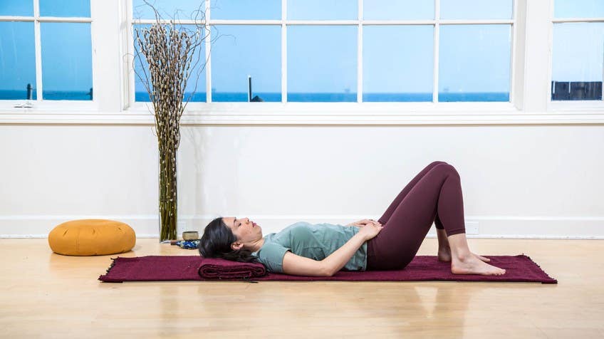 Welcome back. This is a 20-minute practice which includes a lying down meditation into a traditional shamatha sitting practice. So you'll need two blankets, one to lie on and one for underneath your head as well as whatever cushion you use to sit on. Let's begin. So roll onto your back and place the blanket underneath your head. Your knees are going to be knocked together and your feet are wider than your hips. You're going to place your hands on your lower belly and close your eyes. I'm going to sit up and guide you while you remain lying down. Feel your entire body making contact with the earth. Your feet, the right foot, the left foot, your sitz bones, the shoulder blades and the back of the head all dropping into the earth. Take three grounding breaths at the low abdomen arching the spine, inhale, exhale, coming back to neutral. Arching the spine, inhale, exhale, neutral. Inhale, arch and exhale, neutral. Bring your attention to your right foot, the sole of your right foot making contact with the ground. Feeling the sole of the foot, the heel, the pad of the foot, all five toes making contact with the earth, releasing any tension, any holding in the right foot. Now bring your attention to the right knee, feel it resting against the left knee. Its weight is supported. Feel the right shin connecting to the right ankle and to the right foot and the weight of the lower leg into the foot, into the earth. Bring your attention to the right sit bone, releasing any tension that has accumulated there, particularly from sitting, from driving. You can accumulate a lot of tension in our sacrum. So fully releasing the right side of the sacrum into the earth, allowing the earth to support the weight of your body. Now bring your attention into the right hand, feel the subtle sensation of breath underneath your right hand, rising and falling like the waves. And now feel your right elbow making contact with the earth, releasing any tension held in the arm through the elbow into the earth. And now bring your attention into the right shoulder blade. Feel any tension in the right side of the back and the upper back and the shoulders. And now feel that tension melting and releasing into the earth, no longer needing to hold ourselves up. The earth is holding all points of your body. And now bring your attention to the back of your head, releasing any tension in the skull, in the face, in the ears, in throat, into the back of the heart, softening the chest. Now bring your awareness to the left shoulder blade, releasing the tension of the left shoulder into the earth, softening with each breath. Feel the left elbow making contact with the ground, supporting your arm. And now your left hand on your belly, rising and falling with the breath. Bring your mind to your left, the left side of your sacrum, releasing any holding in the glutes and the hips and the low back, dropping it deeper into the earth. Deep inhale into the belly, slide arch, exhale, back to neutral. Two more times. Inhale, arch the back and exhale, neutral. Inhale, arch, exhale, neutral. Feel the left knee knocking into the right, being supported down the front of the leg into the left ankle, the left heel, and ultimately the left foot, relaxing all of the small bones in the foot, the metatarsals, the toes, the heel, the sole of the foot, all dropping energetically into the earth. Now feel all points of your body dropping into the earth, the left foot, the right foot, the left sit bone, the right sit bone, the left elbow, the right elbow, the left shoulder blade, the right shoulder blade, and the back of the head, all dropping and releasing into the earth. Feel the rise and fall of your breath underneath your hands as your whole body is supported by the earth. Deep inhale and exhale. Gently bring movement into your hands and feet, wiggling the fingers and toes, coming back into the room. Open the eyes very softly and you're welcome to continue lying down for the remainder of the meditation or you can roll to your right side. And in your own time, come back to sitting. Find your cushion, place it on your blanket and resume your seat.