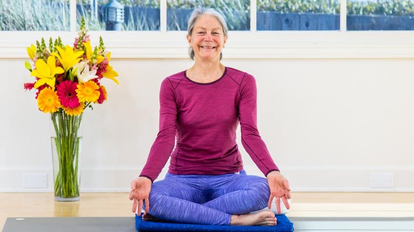 Allow your body to release and open into a nice, full breath. Allow it to go out again. By the way, in Nadi Shodhana, there's no ujjayi, there's none of this closing of the throat, because the delicacy of what happens in the nostrils will be lost to your attention. You won't be able to hear it, you won't be able to feel it, so your breath is as silent as you can make it, and you're bringing in the breath as though you're trying to taste each and every particle of breath. All right, so here we go, here's the positioning.