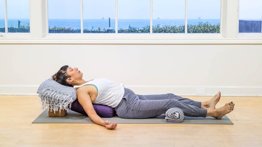 Thank you. And then you've got some options here. If you'd like to stay in the Supta Baddha Konasana to finish out your practice you can do that. Otherwise you might reach down, catch your blocks, slip them off to the sides. And take your hands out and stretch your legs and come right into your shavasana.