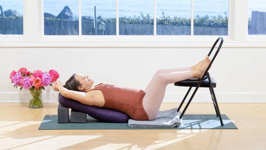 As you're ready we're gonna set up one more time with the blocks on the bolster like we did at the beginning of our practice, but this time we'll elevate our legs, so you might kind of readjust so you're near a chair or even a wall, might feel really good or a couch and then go ahead and bring your chair in, you're just kind of doing your best to measure and I think it feels nice to have a blanket underneath me to pad the sacrum area, you're gonna find your way down slowly, come onto your hip and then find your way onto the bolster as you swing your legs up, again your legs might be up on a chair, up the wall, you might even prefer just lying on your back without a bolster or blocks, just taking a moment to pause. Making those adjustments so it feels just right for your body, your low back, your legs. Getting the legs up is such a wonderful way to help reduce inflammation and swelling in the ankles and feet, I've experienced quite a bit of that on a daily basis, so finding a way to elevate your legs so that they're higher than your heart can be really nice, kind of draining all of the swelling and fatigue, letting that blood and energy flush down the legs and nourishing the pelvis, the baby. And this extra support, this incline can again feel really nice if you're in a stage where you're not resting on your back. You have what's called the vena cava, this branch, this kind of channel that runs up through the spine bringing blood flow to the heart and so often you hear during pregnancy to rest on one side, maybe it's the left side that's preferred rather than the back.