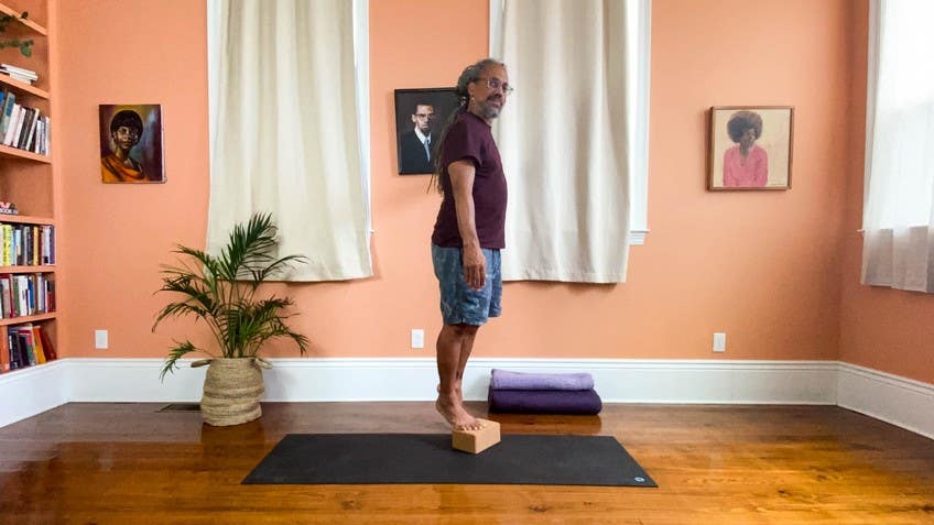 And then shifting off. Take a pause. And coming back. This time, not in front of the heel, not the mid-foot, but just on the heel side of the ball of the foot. Just that side of the ball of the foot. And sink your weight in. Breathing, relaxing the toes. Notice if you're tightening the shoulders to do this, try to find a way to have ease in the pose even if it's kind of an intense self-massage here. Stay at least a minute. And shifting back. Coming off the ball, off the block. Take a pause. And then bringing that same foot, bringing the ball onto the foot, you're going to shift weight forward onto that foot and press down with the ball of the foot, lifting up and getting that calf to work. Balance can be a little tricky here. And then we're going to slowly shift back, keeping the ball on the block and then come into a calf stretch. Hold this for 20-ish seconds. And shifting forward, lifting the heart, pressing down, coming onto the ball of the foot. Feel the calf muscles working on that side. Still breathing while you're working. Still finding ease in the rest of your body. And then slowly lowering down. Let the heel drop and stretch into that calf. Oh yes. Moaning and groaning is absolutely allowed. Relax the toes as you get that stretch. About 20 seconds. Shifting forward again. This time we're going to bend that front knee, come up onto the ball of the foot, shift your weight forward, keep the knee bent, lift up. You'll feel a deeper layer of the calf muscle working. We're getting into the soleus muscle. And then coming back, shifting the weight back. Keep the knee a little bent, let the heel drop and get that deeper muscle to stretch with the knee bend. This one we're going to hold 30 seconds. The longer hold at the end of the three contract relaxes helps reset the muscle length, reset the proprioceptors, those sensors in the muscle that let us know when we're stretching too far or too fast. It helps to reset those. And then slowly coming up, release the foot from the block, feel into your footprints. You may notice if you were to walk around, you probably have a lot more gasoline in your feet, a lot more energy in your feet. Bring your feet comfortably underneath your hips and let's take a forward fold inhaling. Knees soft as you exhale, hinging forward. And just notice how your hamstrings are feeling. As you come all the way forward, bend one knee, straighten the other and slowly switch. And notice which is your tight side, tighter side, which is your looser side. Now I have my loose side and my other loose side, which is good. Inhale, come halfway up, look down at the floor, get your spine parallel to the floor. We're going to do just a little additional stretch on the back part of this, the back muscle part. Exhale, coming further forward. So this is the same technique of contract and relax. Inhale yourself halfway up, your back muscles are working, your hamstrings are probably working here too. Even the neck muscles are engaged. And exhale forward. Third time's a charm. Inhale up.