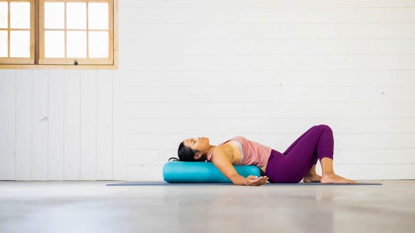 Exhale 2, 3, 4. 5, 6. And let that pattern of breath go come back to your natural breath. And notice any effects of slowing the breath down. I'm gonna start to bring your feet, your knees back to about hip distance apart and gently roll off of your bolster.