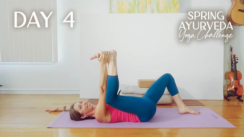 Hello, everyone. Welcome to day four of the Spring Ayurveda and Yoga Challenge. I'm grateful you're here with me today to do a more nourishing slow practice to complement all the work we've done so far, doing all the outer leg work, inner leg work, and all the fun flows and balance poses we've done. So now we get to be a little closer to the floor for this series and dial in a little bit deeper to some of the hip openers that to me are really fun to do for the spring season to target those inner outer legs. For class, it'll be really helpful to have a bolster or big pillow, kind of a firm pillow if you don't have a bolster. One block and one blanket is what we'll use. So let's go ahead and start with a bolster and we'll be on our back for the beginning of the practice. If you make your way onto your back and get your hair just right so your head's nice and neutral, chin parallel to the floor, we're going to put the bolster on top of your torso. Depending on the type of shape of bolster that you have, we're going to turn it to the narrow, tall edge so it's not the big flat wide side but the narrow. And we'll slide the bolster as best as you can up towards the top of the sternum and then you would kind of hug this top end with your arms and then wrap your legs around the lower ends so the ankles cross. This is one of the ways I use child's pose. For some folks, if we have knee injuries or knee sensitivity, it's nice to find a pose like child's pose here on your back. So I also love this as you hug the bolster, the weight of the bolster on your front body. I hope you can start to feel how that helps connect you a little bit more to the ground. And if we can start to maybe tip a little bit side to side so that you feel perhaps a little bit massaged through the muscles on your back sides, more receptive to when you're off balance and you're on the right or the left. And we're going to try to eventually tip ourselves to the center where we can stay and let's root ourselves here as we hug that bolster maybe more firmly in towards your body. And then when everything is in the right place, often it's pretty easy for the eyes to drop back into the face. And maybe you can already feel a little bit of the tension, leave the shoulder area or the back or the hips. And maybe we're inclined to take fuller exhales and maybe even audible exhales to help you get to that place where you feel really complete, perhaps at the end of that exhale feeling more grounded. I thought we'd explore what the yogis call the gunas or in Ayurveda we call the gunas to describe different qualities in nature, but also different qualities we might be experiencing moment to moment. So basically they're pairs of opposites. And I think what's interesting is we observe our opposites. Sometimes when we're aware that we might feel really ungrounded, that if we're looking to do some of the opposite, we might do some pose like this to get more grounded if we were ungrounded. So rather than standing and balancing on one leg, we come down to the floor where we feel the actual earth solid floor underneath us. So it kind of weaves in the sutra of like increases like opposites balance that we can discover again, are we feeling grounded in certain areas of our body or ungrounded? And if we wish to be more grounded, where might we send a little bit more awareness or energy to help make the places that are ungrounded a little bit more heavy or dense? So if we seek feeling more grounded, we can become aware of maybe some parts are grounded, and some might take a little bit more time. So in this kind of floor oriented practice, like it's really helpful to find a shape that encourages grounding and invites us to move more slowly. So then we can eventually feel again, maybe some more softening that encourages more of the water element to move more freely through our system to unify all of our divided parts. And if we're thinking about this element of water for a moment, and you're breathing in and out mindfully, notice, so there's some tissues or areas that feel dry. Some places that might feel more hydrated. What's the general state of your being right now? Do you feel hydrated? Or is there a sense of dryness? You might even be noticing that in the throat or the mouth as you're breathing in and swallowing. You might even notice that in certain tissues that might feel a little bit stiff or brittle. Or do we feel pretty flexible? If we're thinking about that element of water flowing deeper into our tissues, are we noticing generally good circulation and warmth? Or do we feel like maybe there's some areas where there's some stagnation and maybe not the best flow just yet? So I love this idea of the qualities and these pairs of opposites just to help us get to know ourselves a little bit more moment by moment. Let's take maybe one more moment just noticing the qualities present right now for focusing on earth and grounding, water softening, hydrating. When you're ready, let's uncross your legs and release the bolster with your arms and let's take the bolster and send it behind you and you might slide yourself down so you're more at the middle of your mat and you've got that bolster back behind you for potentially your arms. Some of you might like this where you take your arms back and you'd rest your arms, maybe your wrist on top of the bolster. If that feels like it's in the way or a little bit awkward you could always slide it out of the way or some might like tucking your hands underneath it and then slide your arms straight. Okay so with or without a bolster, let's move your feet to the edge of your mat and let's do a little bit of tipping, mindfully side to side for a windshield wiper pose as if it's sort of that time if it was just starting to maybe drizzle a little bit or maybe it's just that chance of rain so there's not a lot to clear from the windshield so we're not moving fast. Trying to create a little bit more hydration and range of mot