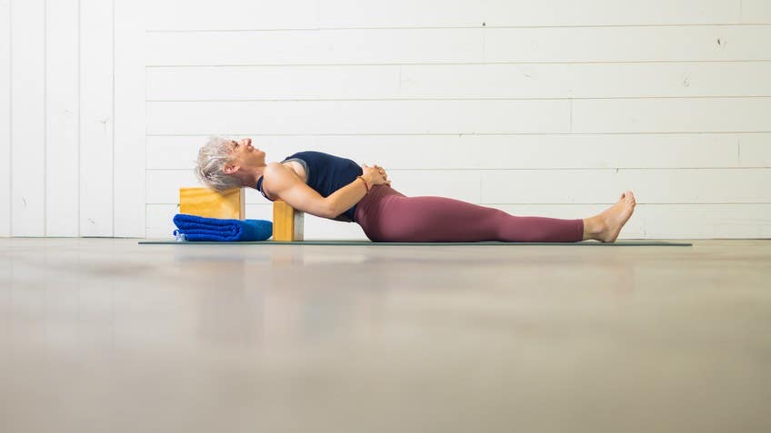 Hi there. My name's Stephanie Tensor, and welcome to Let's Feel Better. What I wanna share with you today is just a short sequence that I often turn to when I'm feeling a little bit dull, a little bit maybe lethargic, and I need a bit of a pick me up. Okay. So what you'll need are two bricks, two blocks, and you may also need some extra height, like I've shown here, with a blanket, and I'll show you how to figure out how much height to use. Okay. Place one place both of the bricks like this, and then lay yourself down so that this brick here is supporting your shoulder blades.