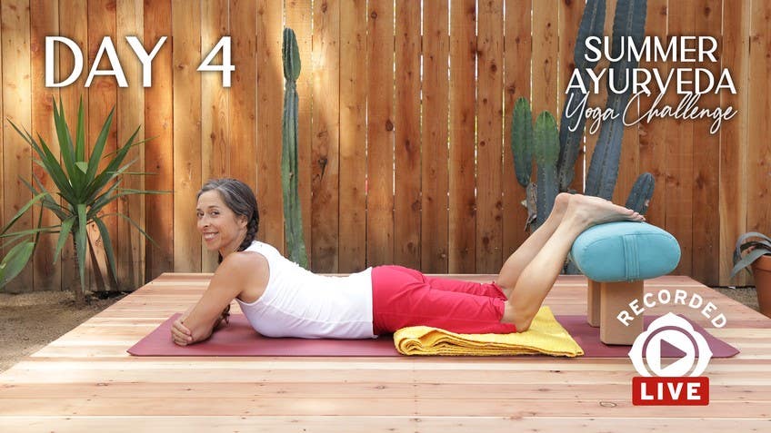 And then go and put your legs up the wall or have your legs up in the bed if you have a wall by your bed to help cool down and decrease any swelling that sometimes happens in the legs at the end of a long hot day. And then the legs up the wall is also a really wonderful restorative pose for a lot of people that can kind of shift you into that rest digest mode to get you ready for a good night's sleep. If there's been any lower back tension in the day, sometimes it can help minimize that. So in addition to some of the ideas that you might be introducing, again, you can go to my book for a slower paced delivery of all this, but some of the ideas that we've introduced are things to keep you hydrated, things that add oil to your skin to add a little bit of moisture because we tend to dry up a lot more in the summer, the long days. Yesterday I introduced that idea of eating more of your meals outside so that your senses get to experience the beautiful colors and smells around you in the summertime that are really quite different than any other season.