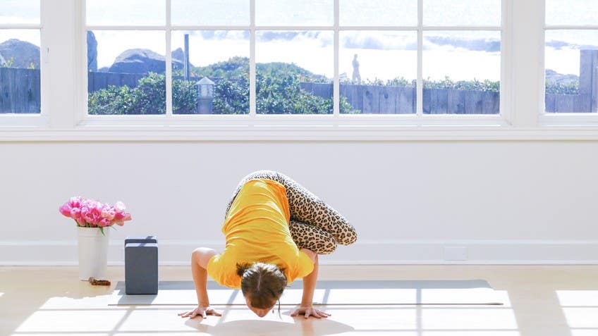 Hi. I'm so glad you're here to practice. We're working in this sequence with finding space for softness and sweetness within stability, within structure, and we'll do that with some twists and some standing postures and some arm balance play. So I'm glad you're here. We'll come down onto the floor to begin, onto the back, in a shape of constructive rest. So you might organize the body with the soles of the feet on the floor and the heels about as wide as the sitting bones and you might notice that I'm like reaching back and feeling where my sitting bones are. You can do that too. It's useful. And then organizing so the knees are in line with the hips and the ankles. Turn the palms of the hands to face the sky and allow your body, invite your body to yield to this support that's already happening, just like. And once you really feel that support, relax into the length of the spine that's already happening. And with your own breath, with your own rhythm and pace of breath, as you breathe in, press the feet into the floor, press the small of the back into the floor. And as you breathe out, relax, come back to neutral. And as you breathe in, press the feet and the small of the back into the floor. And as you breathe out, come back to neutral. And as you do this, you know, we're going through our process of, you know, noticing what is required of our bodies to make this happen. How do I do it? And then noticing what we feel in the body as you move in this way. You might be drawn into the sensation of the back of the body being held. You might notice how we roll from the bottom to the top of the sacrum. You might notice the tiny movements in the back of the skull. And the next time that you're breathing in and pressing the feet and pressing the small of the back, the lumbar curve of the spine into the floor will just pause there and notice the engagement in the body. You might notice up the legs, into the hips, into the core. Taking a full and deep breath into this place. And as you breathe out, let go of all of the effort. And from here, we'll just sort of roll the head from the left to the right. Nice and easy. There's no right or way to do it than how you're already doing it. Noticing the sensation of the floor against the skull. And when you come to rest on the left side, we'll pause there and we'll bring the left hand, maybe the back of the hand, to rest on the right brow. Let your shoulders soften. Let your belly soften. We'll release the arm and roll over onto the other side of the head. We'll place the back of your right hand onto the left brow bone and let everything settle into the support that's already happening. Lots of ease. We'll release that hand from the brown. We'll bring the arms out to T, maybe lowering the hands a bit below the latitude of your shoulders. And then hugging the knees in toward the chest. And you might really sort of hug them in so the tops of the thighs are closer to the torso. And livening the feet. And as you breathe in, breathe into the fullness of the back of the body. And as you breathe out, start to lower the legs toward the right. So rolling over to the right. Breathing in back to the center. And breathing out, lowering the legs to the left. We'll do it a handful of times. And do what's easy on your neck and head. So your gaze might move in opposition to the knees. It might also move with the knees. I'm just letting this be really close to the center. And with your next breath in, we'll bring everything back to the center. You might sort of kick your own keister here, bouncing the heels, before exhaling and extending the legs toward the sky. And we'll organize the body so that the heels are stacked again over the sitting bones. The feet are alive, but the bones are heavy and settled into their sockets. And the hips and the sacrum are settled into the floor. And we'll invite the arms to extend in the same way. So they're parallel to each other and parallel to the legs. And again, like the hands are alive, the arms are alive, but everything is stable and settled. And if everything is so hard and rigid that you can't feel your skin, ease up. Maybe a lot. And if this is so overwhelming through your core that you are silently uttering a mantra that sounds a lot like the F-word, then the knees. A little or a lot. We're looking for that edge where we feel something, but where we're not overwhelmed by it. Go to the center of sensation. What is it? And then how far out do you feel it? And with an exhalation, look at the knees into the chest. Maybe with a sigh of relief. That's over. We'll just sway a little bit from side to side. And we're going to make our way towards standing. And you can do this in the way that makes sense for you. You can roll to one side and come up slowly, or you can experiment with rolling front to back. Don't worry if you don't make it. Just try something. So we'll roll all the way up. And you might pause in Uttanasana standing forward fold while you sort of commit to the feet making contact with earth. We'll press the feet into the floor purposefully, bending the knees. And with a breath in, start to roll all the way up to stand. And you might even sweep the arms, hands, and fingers toward the sky. And as you breathe out, bring everything back to the heart. And notice. And relax the effort of standing. And grab your blocks. Did I mention you might like to have blocks? If not, I will now. So bring your blocks together to the top of the bat. Organize your body again so your heels are beneath your sitting bones. And with a breath in, sweep the arms, hands, and fingers toward the sky. And as you breathe out, press the feet into the floor. Maybe let a bend happen in the knees as you dive forward to Uttanasana standing forward fold. You might place your hands on the blocks. They might be on the floor. As you breathe in, come up halfway, Ardha Uttanasana, and exhale fold. And with a breath in, we'll press the hands into the blocks, step the 