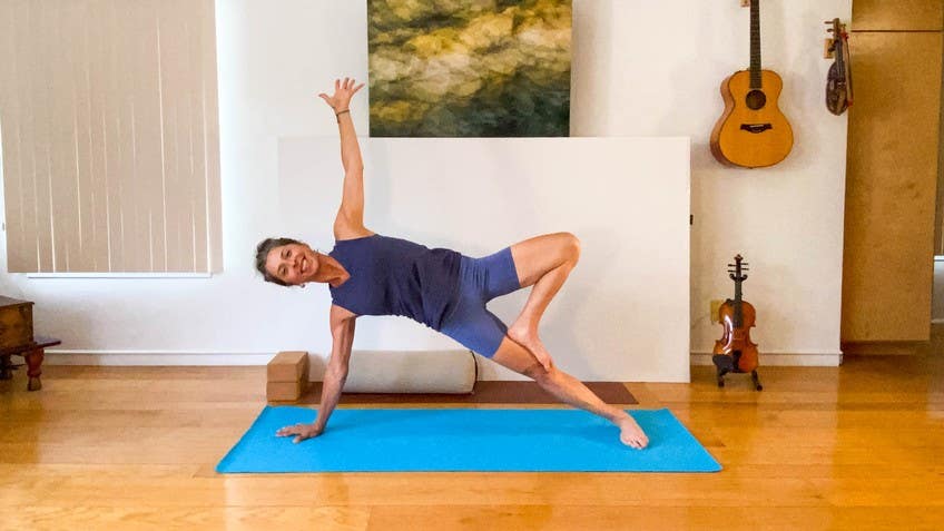 Now come to plank pose. Have both knees off the floor and bring your left knee to the floor. Kick your left foot back a few inches and take your right leg straight. Your right foot's at the back end of your mat there. Left hand under shoulder line, right fingertips towards the ceiling and take your right arm down by your cheek.
