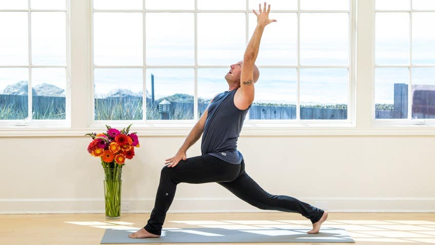 Now again, hands can stay at the heart, or you can extend the left arm up. If you're feeling it all, needing to stay here, stay here, honor where your body is, gaze out in front of you, start to lean forward, find that spot, right hand to the earth, and if you're ready, take the left arm up, keep the right foot really active if you're pressing the wall away, and then softly step back, high crescent, hey, and down to the earth, right knee coming down, left leg straightens, and folding over, just that release for the hip, opening for the hamstring, and as you come back forward, pull the right knee in behind the left, pause a moment, and then seated, yeah. So again, if you're leaning too much, again, take the right leg out this time, if it's here, lengthening, lift up, cartwheel your left arm back behind you, press in, right arm rising, yes, and take that right elbow across, and sometimes as we begin to twist, you can feel the shortening of the breath, so slow down, let yourself lengthen, and coming back center, now press the hands, take a little counter twist, neutralize the spine, and coming forward, now pull into the core, send it back to lunge, back to plank, your vinyasa, or we'll all meet back into down dog, as you're breathing here, inhale, take a moment, inhale, and exhale. So walking the feet now, coming to the center of your mat, inhale as you lengthen, and exhale as you fall, so as we rise up, drawing down through the center, going to turn to the side, so you can see this, so finishing up, inhale, lift, and exhale as you fall, let the body rise halfway, and folding here, now bend the knees, sit deep, hands coming to the heart, and again taking that twist, now pause, for some this is your end of your practice, just being here can be challenging enough, so this could be for beginners, those who have a more advanced practice, feel that extension of the right arm, those who want to go deeper, extending the left arm, and now if you're up for it, coming down, you can you can stay here, hands at the heart, or lean to the side, keeping that leg pulled to the center, press down, and pull the heels in, smile if you're coming up, all our mouths should be done with a smile, pull back, and right we come back, and those of you who paused here, just breathe, come back, center rising, hands to the heart, so we have the left side, one more time, inhale, lift, exhale, and fall, inhale halfway, and fold a little deeper, take it to the left, bend the knees, rise up, hands to the heart, as you pause, take a moment, come across, and so again, if you're new to the practice, stay here, there's nothing that says you need to go deeper, no one's gonna make you, I promise you won't get a ticket, those who want to go maybe further, coming down, and maybe here, maybe the hands come to the earth, leaning to the side, and pull up, and the feet will come back, we come back center, rising, and fold, so stepping the feet out, just distance of the mat, we'll turn to the side again, and then letting yourself coming down, and taking that right arm out, extending shoulders on the inside, adding a little twist here, reach up, one more cycle, changing sides, left arm down, shoulder to the inside, and the right arm rise, coming back center, pause, breathe, let the hands come down behind, sitting to the earth, slightly, bringing your legs out, making sure sit bones are grounded now, feet are active, and all that rising energy, so your spine should feel nice and awake, so press down, lift up, inhale, rise, hinging at the hips as you fold, now take hold, whether the ankles, the feet, draw the heart forward, lengthen, feel as your spine grew now today, and then lead with the heart as you fall, take a moment here, just pause, and slowly roll the body up, and gently drawing the knees in, as you roll now down onto your back, keeping that drawing in, open the arms out, let the knees drop over, let's take it to the left first, and if you have any neck issues, keeping the head neutral, let your gaze softly turn to the right, coming back up center, the knees drop over to the right, keeping the head centered or neutral, letting your gaze turn to the left, and then coming back center, hugging in, give yourself a big hug, and letting the legs extend out, arms release, final rest, shavasana, just letting yourself now, just pause, just feel the breath growing softer, feeling that radiance of the divine, letting yourself let go, and these final moments here, just for you, before the rush of the day, just allowing yourself to breathe, to surrender, feeling these quiet moments just for you, as you take a deep breath now, inhale, exhale completely, as you draw the knees in, giving yourself a big hug, and gently rolling off to your right, let your right arm just make a little pillow, just pause a moment, as you press down into the earth, feel the body rising, and just come in seated, whatever is comfortable, let the spine lengthen, and like we began taking hasta mudra, palms of the hands balanced between heaven and earth, and the softening of your practice, these moments here, to witness, to feel, allowing just to be, as you draw to the heart center, offer and closing the sound of own, inhale, as you honor the god, goddess within, satguru, namaste.