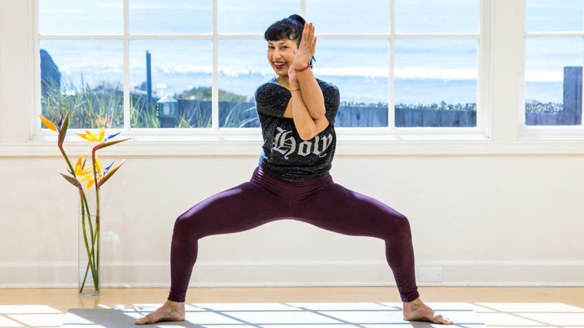 Last time with this inhale, reach the arms up. Exhale, folding forward. Send your right leg back, looking forward, downward facing dog. Plank pose, lifting the heels, legs stay strong for Chaturanga. Inhale into upward facing dog. Flip the toes, reach through the heart and exhale back, downward facing dog. Take your right leg up. Step it outside of your right hand. Step your left foot outside of your left hand, coming back into a squat. Hands down, hips high, long legs, parallel toes, soften the knees and roll up. Last time inhale. Exhale, folding forward. Step the left leg back. Right into down dog. Plank pose, lower it down, rising back up. Hips high, down dog. Take your left leg up. Step it outside of your left hand. Step your right foot outside of your right hand, come back into your squat. Hands down, hips high, long legs, parallel toes, soften the knees and roll up. At the top, reach the arms up. And have a moment back in your Tadasana. And then you'll step the feet together and come into Utkatasana. Sinking the hips back, reaching up through the arms. And again, just a moment to feel the legs underneath you. And then fold forward over your legs. Come onto your fingertips and lengthen out your spine. And then you can hop, but I like to step for this one. Coming through Chaturanga, inhale up dog and exhale back, downward facing dog. And we'll start our standing poses. Lift your right leg up, step it in between your hands, spin your back heel down. Come on up into warrior one, reaching up through the arms. And if the shoulders need more space, you'll just keep the arms apart. Lengthen out your right leg, take your arms back behind you, lift your head, lift your chest, lean back on your inhale, deep bend of your right knee, arms stay winged back behind you, folding forward, drop your head. Send your left arm forward, up and over, we'll come into warrior two, you might need to adjust the back foot. And then turn your right palm up and lean back into peaceful warrior. From there, hands come down to the ground, step back, and we'll take it through a vinyasa. And if the vinyasa feels like too much today, skip it, hang out and down dog, and we'll meet you on the other side. Reach your left leg up, step it in between your hands, spin your back heel down, come coming up, warrior one, reaching up, and then lengthen out your left leg, take your arms back behind you, a moment just to lift the chest, and then deep bend of the left knee to fold forward, drop your head, let your neck go, coming back down towards the ground. Right arm reaches forward this time, circle it around, coming into warrior two, nice wide stance, turn your left palm up, lean back, peaceful warrior, reach through the side waist and then let your hands come down to the ground, step back, vinyasa, or right into your downward facing dog. And then we're just going to build on that sequence. So lift your right leg up, we'll start off exactly the same, stepping forward, spin the back heel down, coming up into warrior one, lengthen out your right leg, arms come back behind you, lift the head, lift the chest, that's your inhale, deep bend of the right knee folding forward on your exhale, stretch your left arm forward, chase it up and over, let's come into warrior two, leaning back into a peaceful warrior, and this time we're coming right into extended side angle uttita parsva kanasana, so forearm to the right thigh or right hand down to the ground or a block, sweep the left arm over your ear and then stay long in the entire left side of the body, keeping the shoulder blades dropping down, the legs are enough to hold you here. From there come back into warrior two, right away, lengthen out your right leg, lean back, reverse triangle, pulling up out of the legs, out of the hips, out of the lower back, let your hands come down to the ground, step back, take it through your vinyasa. So the poses just start to layer in a couple at a time, slow and smooth, lift your left leg up, stepping forward, spin your back heel down, and there's a lot of deliberate movement in the feet, reach the arms up warrior one, lengthening out your left leg, take your arms back behind you, lift the head, lift the chest, leaning back, deep bend of your left knee as you fold forward, send the right arm forward, up and around into warrior two, lean back into your peaceful warrior, extended side angle with the breath out, again forearm to thigh, or left hand to the ground or a block, sweep the right arm over you, and as you're here, can you get a sense even that the heels are pulling in towards each other so that the legs stay super stable, come back up into warrior two, lengthen out your left leg, lean back, reverse triangle, reach through the side waist, let your hands come down, step back, chaturanga dandasana, inhaling upward facing dog, and exhaling back downward facing dog, reach your right leg up, last time with this sequence step it forward, spin your back heel down, let's come up warrior one, reaching up, lengthen out your right leg, take the arms back behind you, big lift there, open up the chest, draw the shoulder blades together, you're a little warmer here so see if you can go deeper, the head is dropping, stretch the left arm forward, up and around into warrior two, turn the right palm up, lean back, peaceful warrior, coming right into extended side angle, and coming into it a little bit deeper this time, whatever that means to you, it could be the physical body, it could be that the breath has deepened, or hopefully the mind feels a little bit more focused and present, and then when you're ready, coming up warrior two, lengthen out your right leg, lean back, reverse triangle, reach through, and coming right into your triangle pose, right hand will come down, left arm reaches up, and I like to connect the thumb and index finger in my triangle pose with the upright hand, just a little reminder, mudras are such a great way to bring intention into the pr
