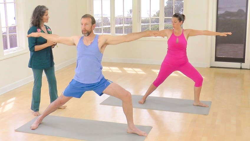 Hi, welcome back. Thank you again Julie, Matt, and Winifred for being here. Though let's take a look at Warrior II, sometimes known as Virabhadrasana II. Vira in this case, V-I-R-A, is usually translated as hero. So what I'm gonna do is I'm gonna instruct my friends into the posture, hopefully to help them be set up for success, and then the request is for you to see, if you can see among our friends, how the posture might look a little bit different, and then we'll make an attempt to dial it in a little bit more and see if we can talk about a few of the details. Okie dokie. So we'll start in Tadasana. So all of you at the front of the mat, and this time let's start in Tadasana with the feet a little closer. So balls of the big toes dusting. If you have bunions that's super easy. Lift up through the toes, spread. Let your heart feel generous. Let your mind feel light. Ok, maybe big deliberate inhale. Exhale everything. Beautiful. And then as you feel ready, let your hands come onto your waist, and please step your right foot back. Now as you step your right foot back, turn your hips, and in our case, our hips are pointing towards the patero grill. I'm not sure where your hips are pointing at home, but now as you're finding the distance between your two feet, the play here is you want your feet to be wide enough so that as you bend this front knee, the knee lands about over the ankle. So just like back in and out of that a couple times. Lift up, bend in, and just adjust. Generally if you're going to take a shorter stance, ok, if you're going to take a shorter stance, then you take a shorter stance, but you don't let your knee come beyond your ankle. Yoga teachers love to argue about almost everything. Nine out of ten will agree on this one. Ok, so just to make sure that I'm being clear. So when I say knee over the ankle, I mean knee right over the ankle. This is about the distance. So Julie, you might just stop right there because you're in a slightly shorter stance. That's perfect. Now all of you, let your legs straighten. Let that front left leg straighten, and we'll dance with this a little bit. Usually we call this warrior two dance. So inhale your arms up over the top of your head. Now take a moment here and take a look back at your back right foot. When you look back at your back right foot, it will help ground the position. Let that right sit bone draw under just a little bit to the left heel just to help your pelvis even. Wiggle up a little bit longer. Beautiful mat. And we're gonna dance with this. So inhale here, and as you exhale open your arms out, warrior two. Let the front knee bend. Beautiful. Four more like that. Inhale, come up. Keep your gaze at the back foot. Exhale and open. Beautiful Julie. Inhale, come up. So nice. Exhale, open. Beautiful. Two more like that. Yes, open. Beautiful. Now one more like that. Inhale, open. And on this last one I'm gonna ask the three of you to hold the shape. Okay, now as you hold, do you remember the generosity of heart in Tadasana? Yes. Can you let the sit bones relax? And since most of you, your gaze now has come right over your heart. Let your gaze be out over the heart. Now last little alignment detail. Try this. Squeeze your shoulders up and around your ears. Nice. Exhale, drop. Let your elbows bend and let your palms turn up and just see how that feels. Last few beats. Beautiful. Okay, nice.