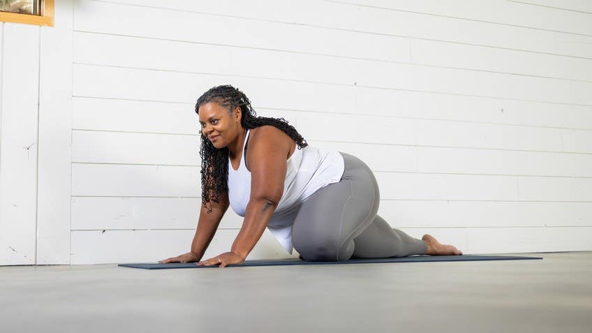 So you're twisting away from your right knee. And, again, you might feel like setting upward feels really good and right, or you can come down to your forearms, blocks, or even a bolster. How you decide is noticing how much you want to experience of the twist on the left side and also how much is happening in the front of your left hip. Deep in your breath. And slowly make your way back to extended arms if you're under 4 arms.